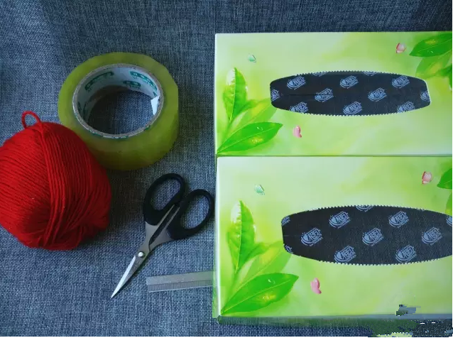 首先,要用紙盒來織圍巾的朋友先備好紙巾盒2個(gè)、毛線1卷、刀片剪刀、透明膠帶。