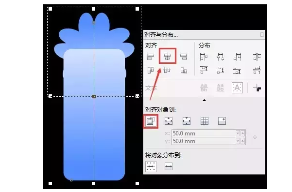 設(shè)計(jì)服裝吊牌的第四步:居中對(duì)齊 使用“矩形工具”繪制矩形,在屬性欄中設(shè)置矩形“圓角半徑”為6。復(fù)制上一步驟中填充色;選擇兩個(gè)造型,執(zhí)行“窗口”→“泊塢窗”→“對(duì)齊與分布”命令,首先選擇對(duì)齊對(duì)象到“活動(dòng)對(duì)象”,對(duì)齊方式選擇“水平居中對(duì)齊”,如圖所示。
