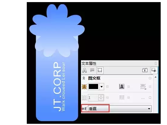 設(shè)計(jì)服裝吊牌的第六步:輸入文字 用“文本工具”單擊,調(diào)整“文本屬性”為“垂直文本”輸入服裝品牌名稱,分別執(zhí)行一次“水平鏡像”和“垂直鏡像”達(dá)到如圖所示效果。