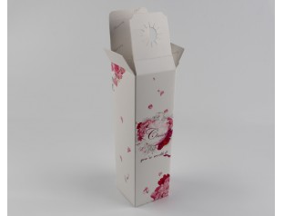 飄散著的粉色花瓣,制造了一種浪漫、溫馨的感覺,情侶間共享燭光晚餐不防也帶上這樣一個酒盒包裝,渲染一下氛圍。駿業(yè)包裝設(shè)計印刷的紅酒盒一如既往的平整干凈,厚實、美觀,精湛工藝可見一斑。酒盒開口處那固定酒瓶的圓孔設(shè)計,別出心裁,卻為攜帶的安全性帶來一份保險。