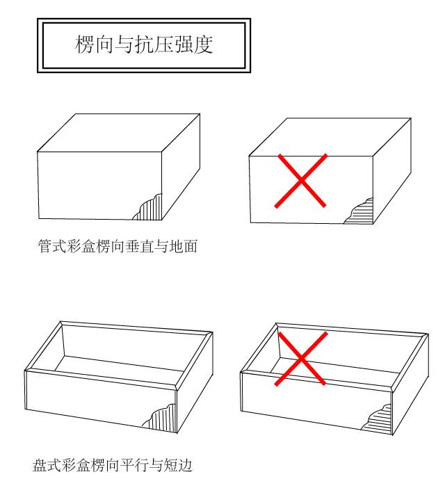 瓦楞紙箱,楞向的縱向的抗壓強(qiáng)度比橫向高很多。管式彩盒一律采用豎紋,讓楞向垂直于地面;而盤式彩盒盡量要楞向平行與較短一邊,這樣的安排獲得比較高的抗壓強(qiáng)度。