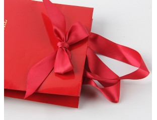 紅色在中國算是最受歡迎的顏色了,代表著喜慶、大氣,有留意的話會發(fā)現(xiàn),很多中國的珠寶商都喜歡用紅色來做珠寶的包裝、陪襯,紅色的珠寶首飾紙袋當(dāng)然也少不了。這款禮品紙袋使用雙銅紙為主要材料,袋子表面logo使用精美的燙金工藝,凸顯品牌質(zhì)感;拎手選用了絲帶,這個(gè)袋子的手拎特別有意思,不是跟其他的紙袋那樣打結(jié)或者這膠封,而是采用在外面打蝴蝶結(jié)的方式,不僅固定住了拎手,而且還裝飾了紙袋,一舉兩得。袋身由紅色專色印刷而成,做工精細(xì),印刷精美,尺寸可按需求定制。
