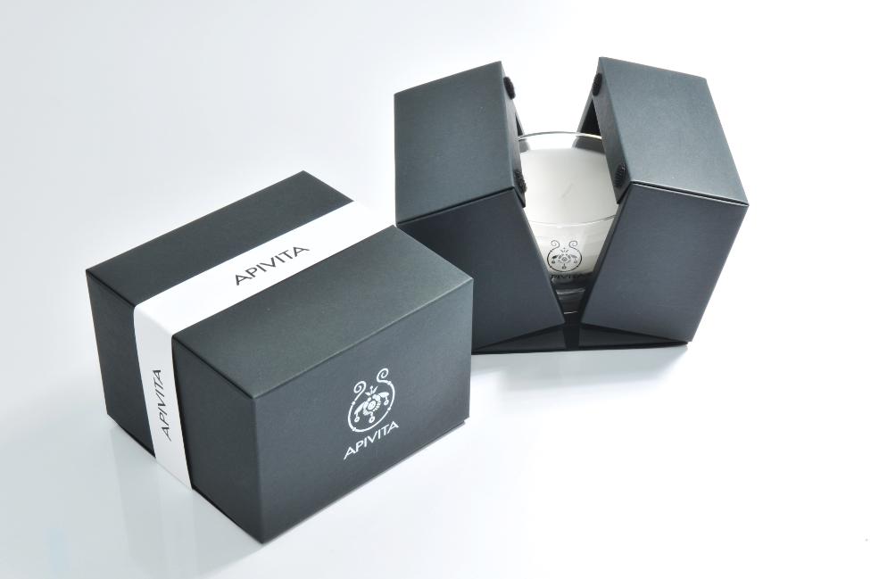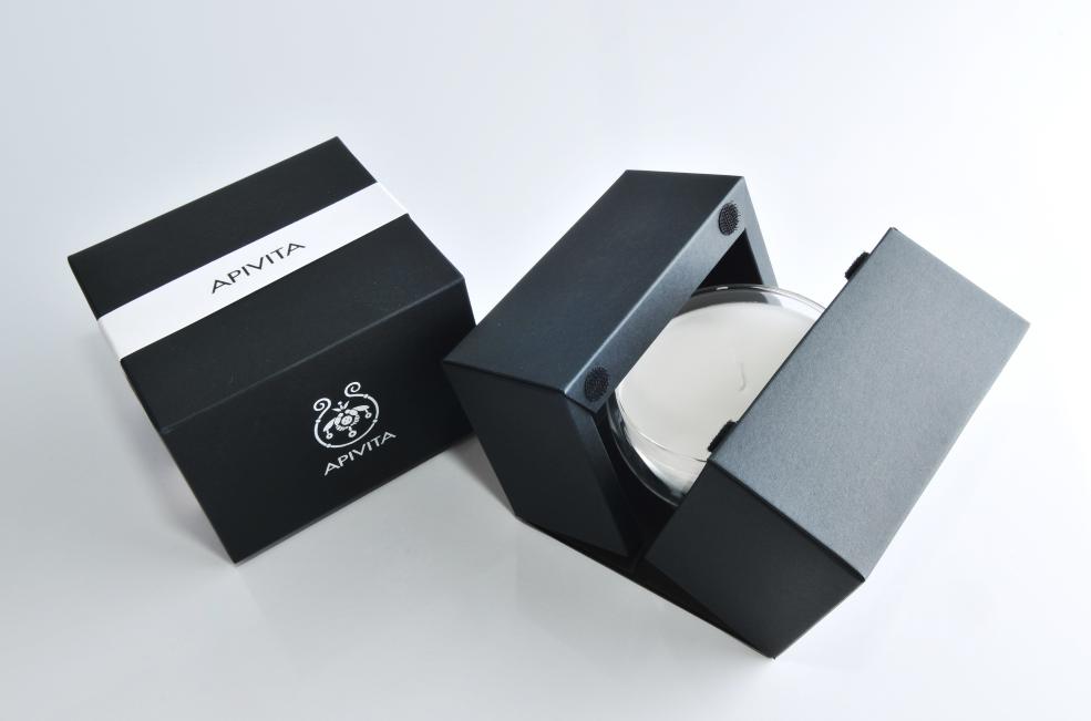 APIVITA香薰蠟燭包裝,黑色卡紙的盒型結(jié)構(gòu)比例合理、結(jié)構(gòu)嚴(yán)謹(jǐn)、造型簡單精美,突顯出盒型的形態(tài)與材質(zhì)美,力求達(dá)商品保護(hù)并襯托出透明蠋臺的層次感,左右開盒的禮盒效果展現(xiàn)商品驚喜的價(jià)值感。