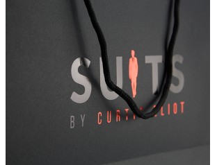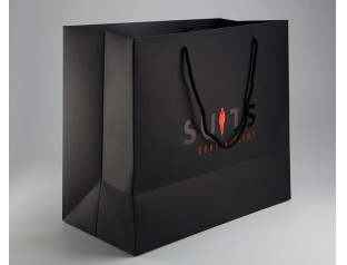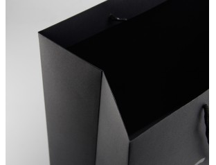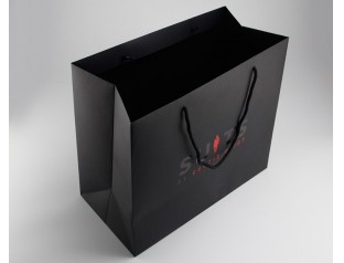 此款手提袋采用特種紙的材質(zhì),商標燙紅金和黑金,打圓孔穿黑色棉繩。