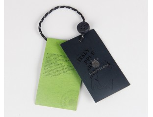 此款服裝吊牌制作,采用400g雙銅紙,商標(biāo)燙銀服裝吊牌設(shè)計采用了綠色和黑色的搭配,能給人一種協(xié)調(diào),美觀,大方的感覺。服裝吊牌制作加上尼龍圓繩的暗扣吊粒,簡單,清新。