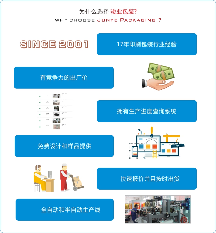 廣州駿業(yè)包裝實業(yè)有限公司創(chuàng)建于 2001年,是一家以印刷包裝制品為主營業(yè)務(wù)的集設(shè)計、生產(chǎn)、銷售為一體的一般納稅企業(yè),主要生產(chǎn)各種精品包裝盒、紙袋、吊牌,其主要應(yīng)用于服飾、皮具、化妝品、保健品、禮品、首飾、茶葉、酒類、電子產(chǎn)品及其它日用制品等行業(yè),并通過了德國萊茵認(rèn)證、BV認(rèn)證、SGS認(rèn)證和WCA認(rèn)證.